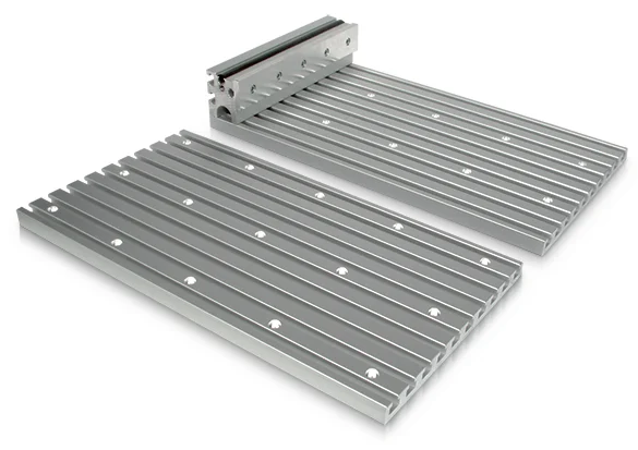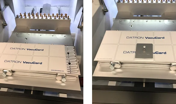 The DATRON neo can accommodate two vacuum tables, which can be operated independently of each other. A sacrificial layer that is air-permeable (VacuCard) is placed on the vacuum table (no gaskets!) This allows for parts to be cookie cut without milling into the table.
