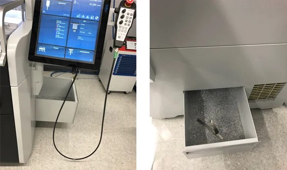 Chip disposal could not be easier because the DATRON neo features a removable drawer allowing the clean, dry aluminum chips to be vacuumed out. The neo also uses a Minimum Quantity Lubricant (MQL) system instead of a traditional flood coolant system.